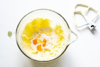- Retire a manteiga da geladeira com 10 minutos de antecedência. Em uma batedeira planetária com o gancho “k”, ou em uma tigela com uma colher ou à mão, misture a manteiga, o açúcar, o mel e uma pitada de sal até que tudo fique homogêneo. Junte as gemas, o ovo inteiro e o creme de leite (líquidas, não batidas) e mexa até que os ingredientes também sejam absorvidos pela mistura.
