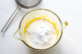 - Adicione 500 g de farinha e o fermento à tigela, tendo o cuidado de peneirar para retirar quaisquer grumos. Sove até obter uma consistência pastosa.