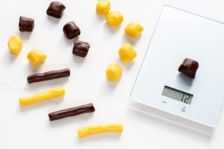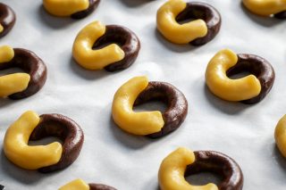 4. Após o tempo de descanso na geladeira, divida a massa branca e de cacau em pedaços de 12 g cada. Enrole as bolas de massa até obter uns cordões de 7 cm de comprimento.