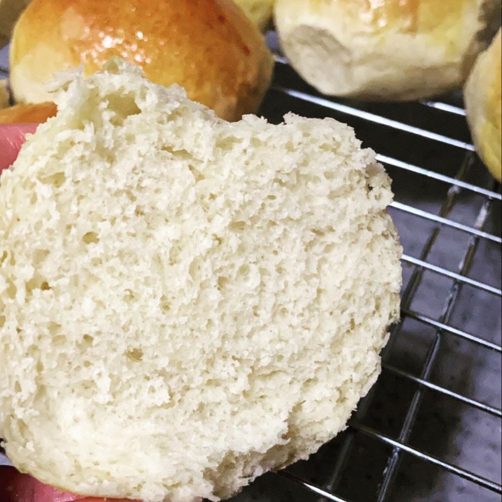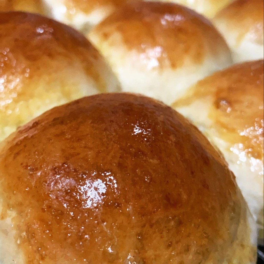 Coloque numa vasilha acrescente 2 xícaras de farinha de trigo o fermento . Misture bem com uma colher de pau. Acrescente o restante da farinha. Misture bem com uma colher e depois com as mãos. Só pra misturar. Deixe descansar por 5 minutos. Coloque numa bancada enfarinhada e amasse. Não precisa sovar muito. A massa tem que soltar da mão. Corte a massa em pedaços iguais. Faça bolinhas e ponha em assadeira untada. Deixe descansar até dobrar de volume. Eu coloquei no forno desligado uma vasilha com água quente e deixei a forma com pães crescerem lá dentro. Após uns 30 minutos meus pães estavam crescidos. Passe um ovo misturado com azeite por cima com cuidado pra não desinchar os pães. Leve para assar fendei assar em forno pré aquecido a 180 graus até dourar. No meu forno demorou 30 minutos. Depois de assado passe manteiga por cima.