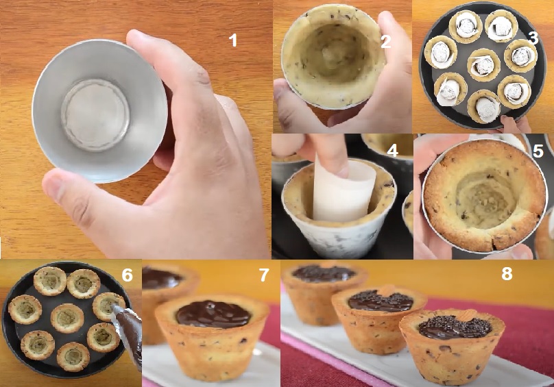 Em uma tigela, misture a manteiga e os açúcares até formar uma pasta. Adicione o ovo, as gemas, a baunilha e o sal e misture até incorporar. Junte a farinha de trigo, aos poucos, mexendo até formar uma massa homogênea. Não é necessário misturar muito. Acrescente as gotas de chocolate e misture delicadamente. Pegue porções da massa e ajeite dentro de forminhas para bolinhos, apertando com os dedos. Leve ao congelador por 1 hora. Retire, forre o interior com papel manteiga e preencha com papel-alumínio para que os copinhos não desmanchem enquanto assa. Leve ao forno médio, preaquecido, por 15 minutos ou até firmarem. Retire, desenforme e deixe esfriar. Misture bem os ingredientes do recheio e coloque em um saco de confeiteiro. Recheie os copinhos, decore com confeitos e avelãs e sirva em seguida.