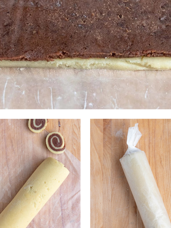 - Há espaços entre a massa de baunilha e a de chocolate. Depois de empilhar as massas, pressione-as levemente para remover quaisquer bolhas de ar. Além disso, ao enrolar as massas, vá devagar, certificando-se de que a borda frontal esteja dobrada para baixo.