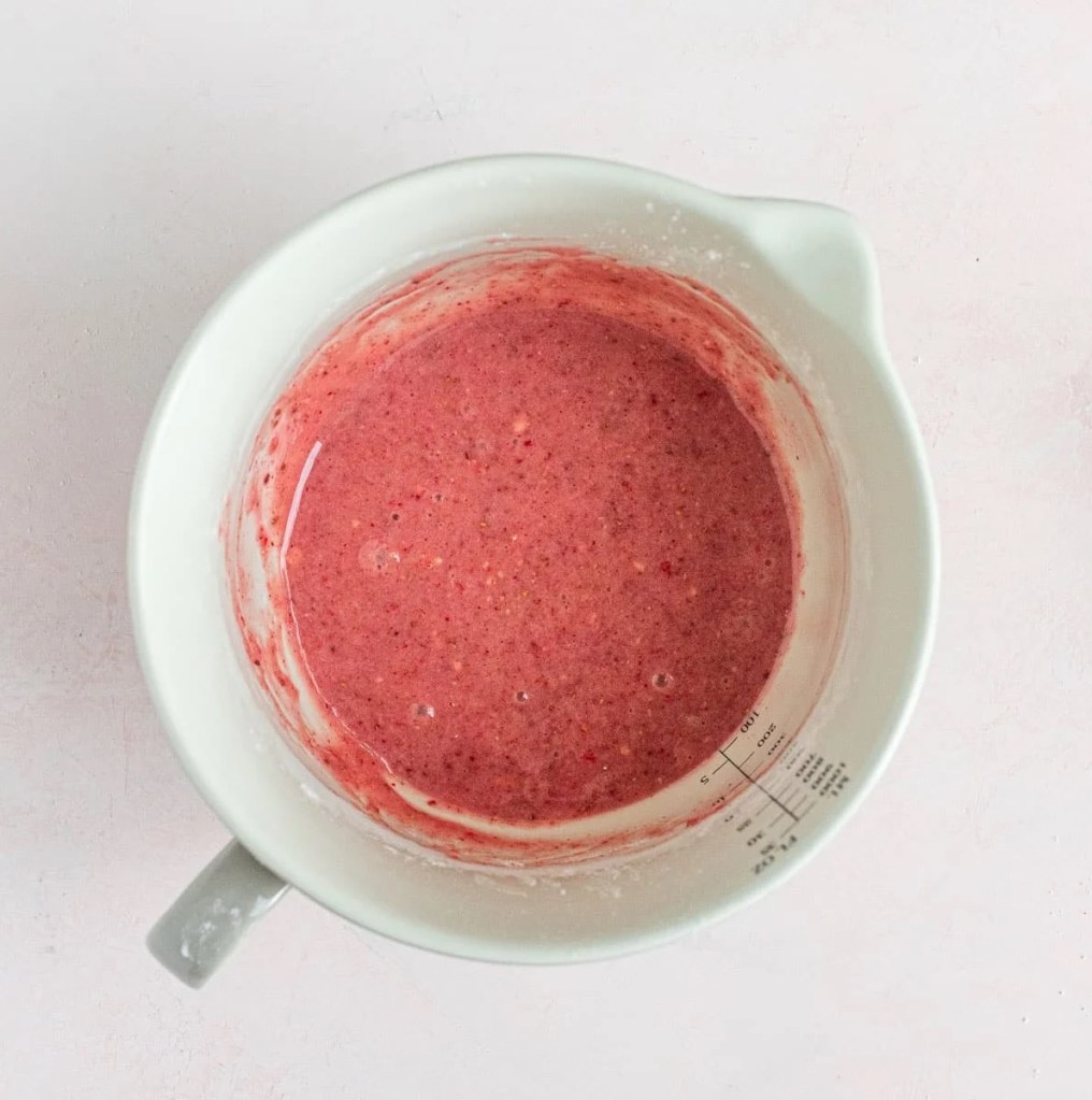 • Se você não tiver um processador de alimentos, coloque os morangos em um saco plástico com fecho hermético para freezer. Use um rolo de massa para bater os morangos até que fiquem em pó e finos, sem pedaços grandes ou utilize seu liquidificador. Despeje os morangos na tigela com a farinha e misture bem.