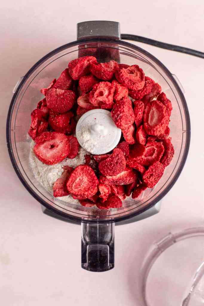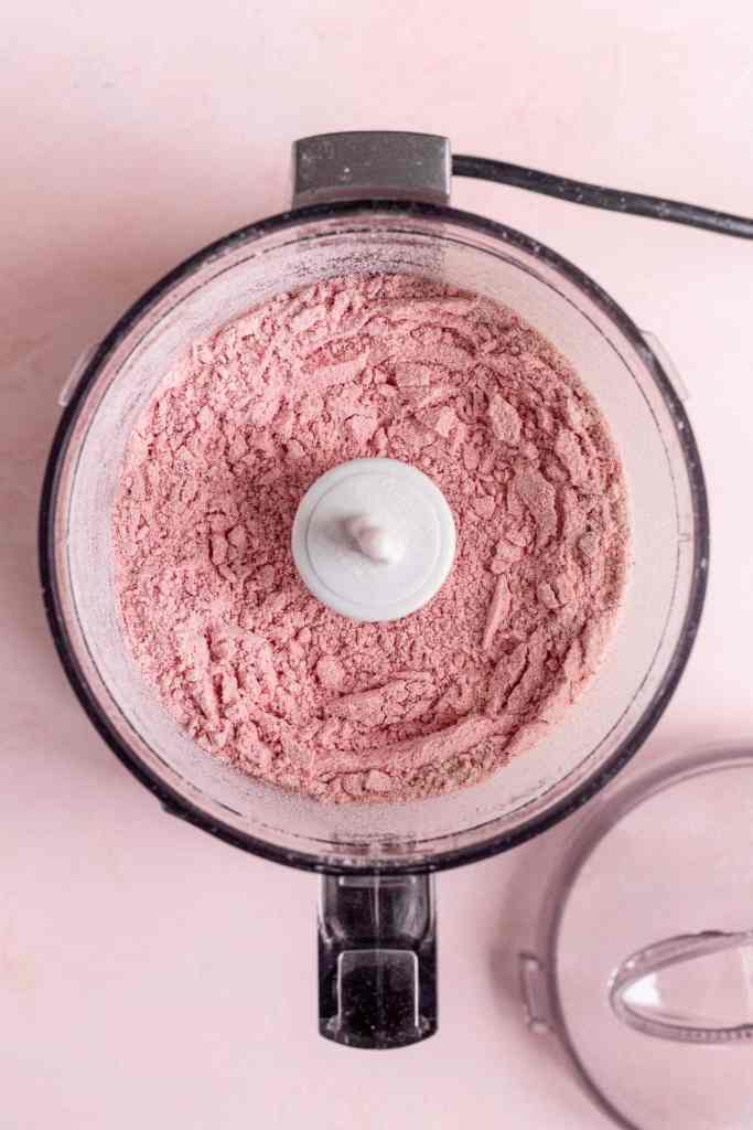 • Coloque o açúcar de confeiteiro e os morangos desidratados na tigela do mini processador de alimentos e processe até que os morangos fiquem em pó e toda a mistura fique rosa claro.
