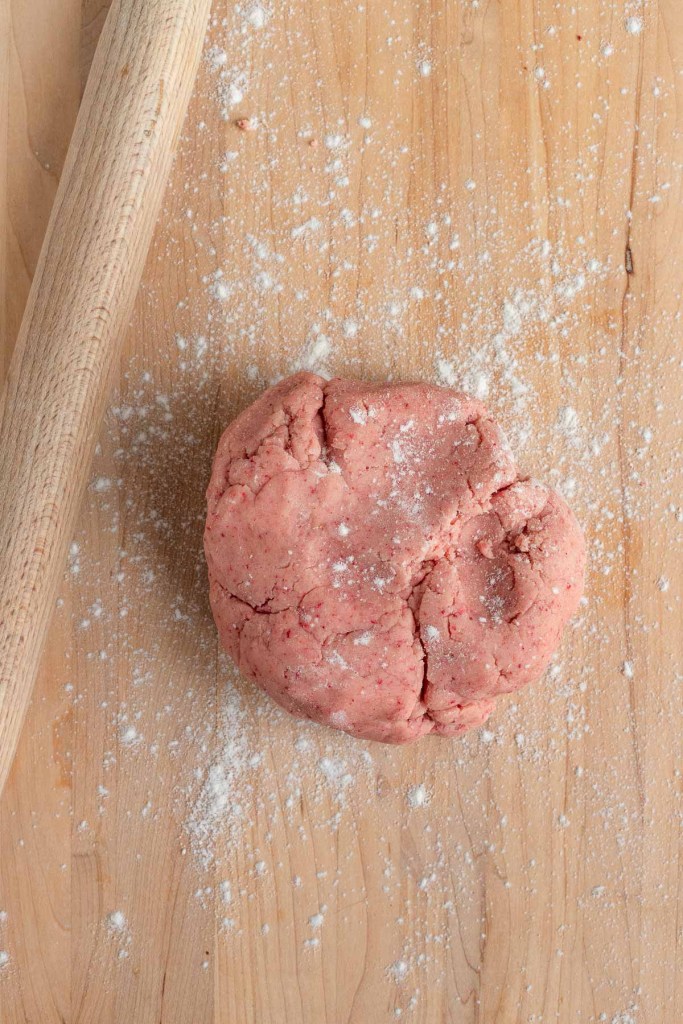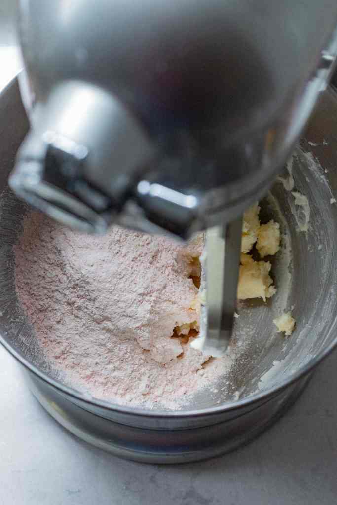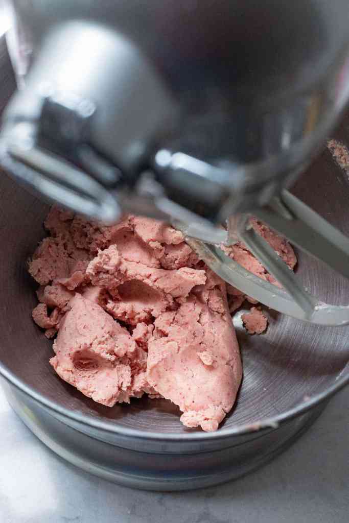 • Adicione toda a mistura de farinha e morango de uma só vez. Ligue a batedeira em velocidade baixa e bata até que todos os ingredientes secos estejam homogêneos e a massa forme uma bola lisa. A massa ficará esfarelada no início, mas depois formará uma bola.