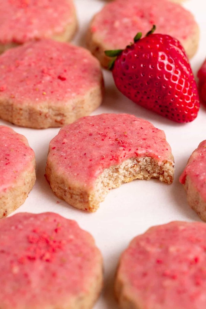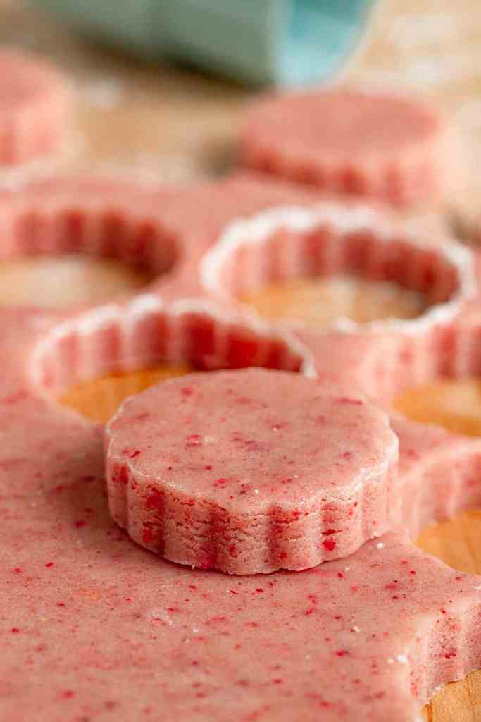 Estes biscoitos amanteigados de morango são absolutamente deliciosos e os melhores biscoitos de morango que você já provou. A receita é baseada no meu biscoito amanteigado clássico e os morangos desidratados garantem um sabor incrível e autêntico de morango a cada mordida. Um sabor mais intenso e marcante