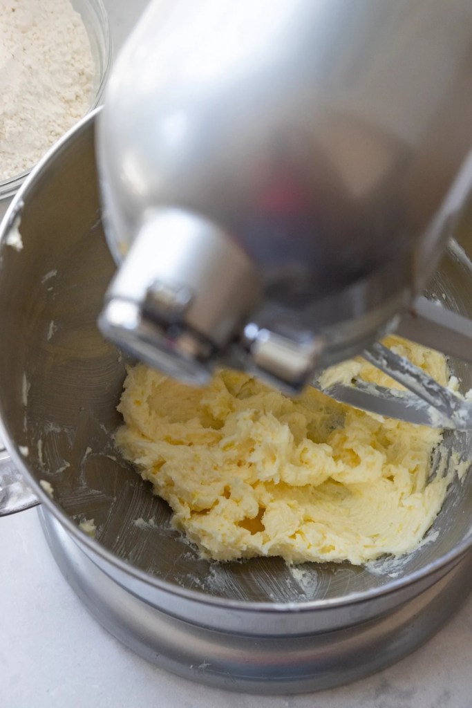 - Adicione a manteiga e o sal à mistura de limão e açúcar. Bata em velocidade média com o batedor até obter uma mistura lisa e cremosa, cerca de 2 minutos.