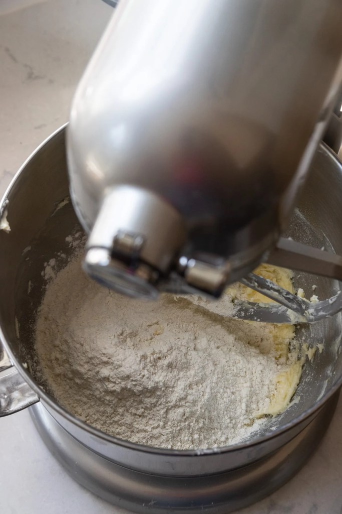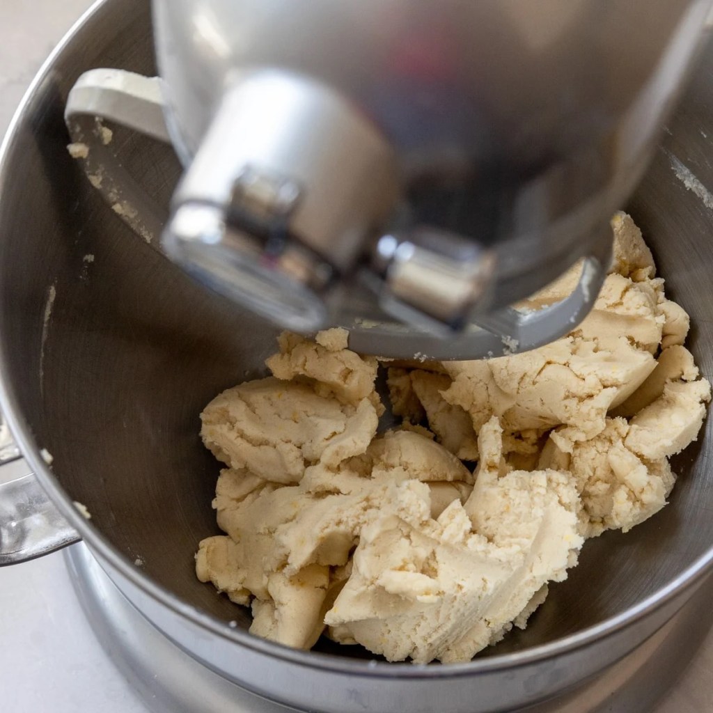 - Adicione toda a farinha e bata em velocidade baixa até que toda a farinha esteja incorporada. A massa estará esfarelada neste ponto. Aumente a velocidade da batedeira para média e bata até que a massa se misture e forme grumos grandes, mas se preferir essa finalização poderá fazer na mão.