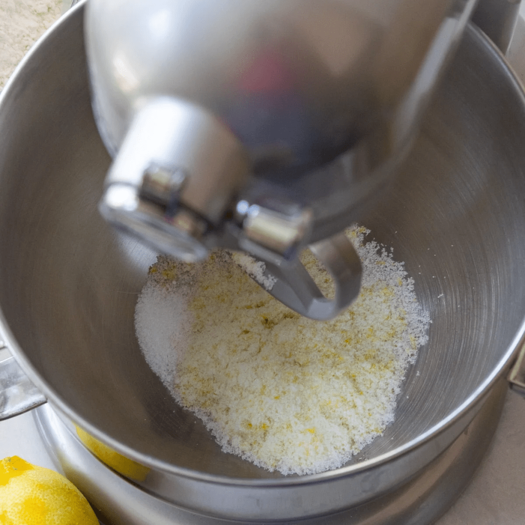 - Coloque o açúcar na tigela da batedeira. Raspe as raspas dos limões diretamente sobre o açúcar. Use os dedos para esfregar as raspas no açúcar, até que fique uma textura arenosa.